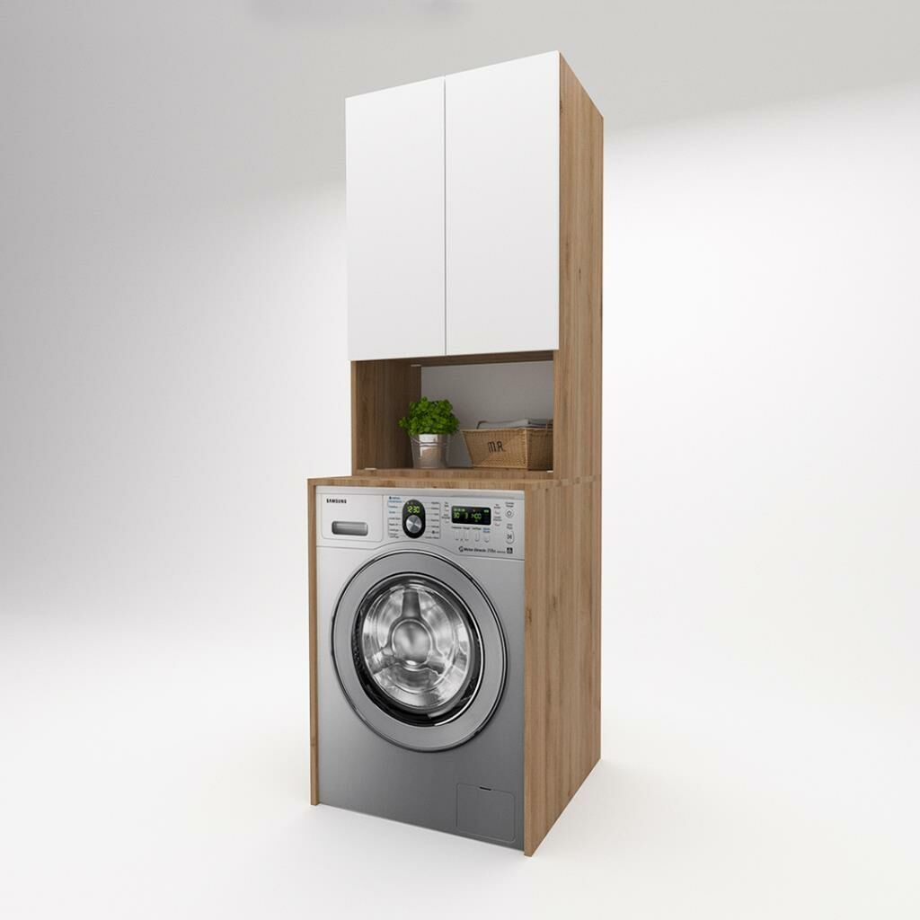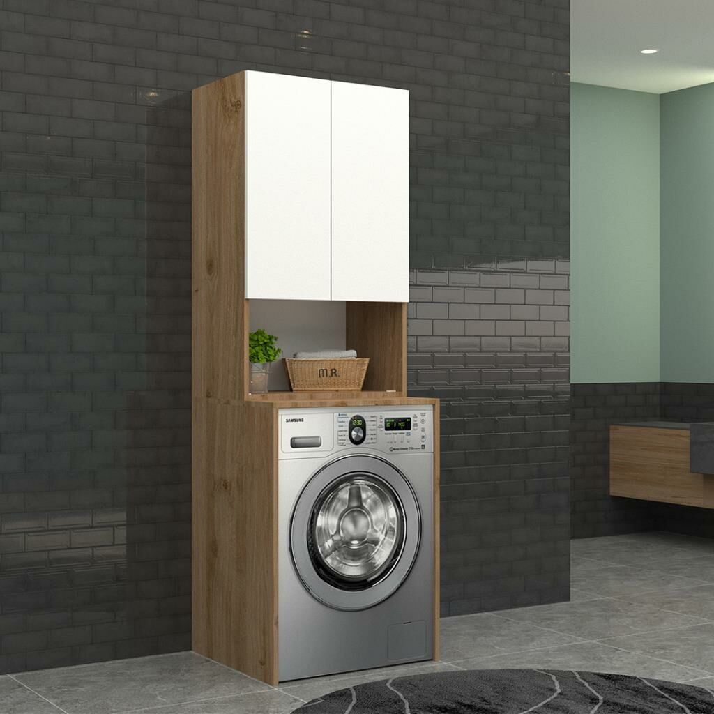 Trio Pazaryeri Çamaşır Makinası Dolabı - 65 cm - 2'li Set - Meşe - HighGloss Beyaz