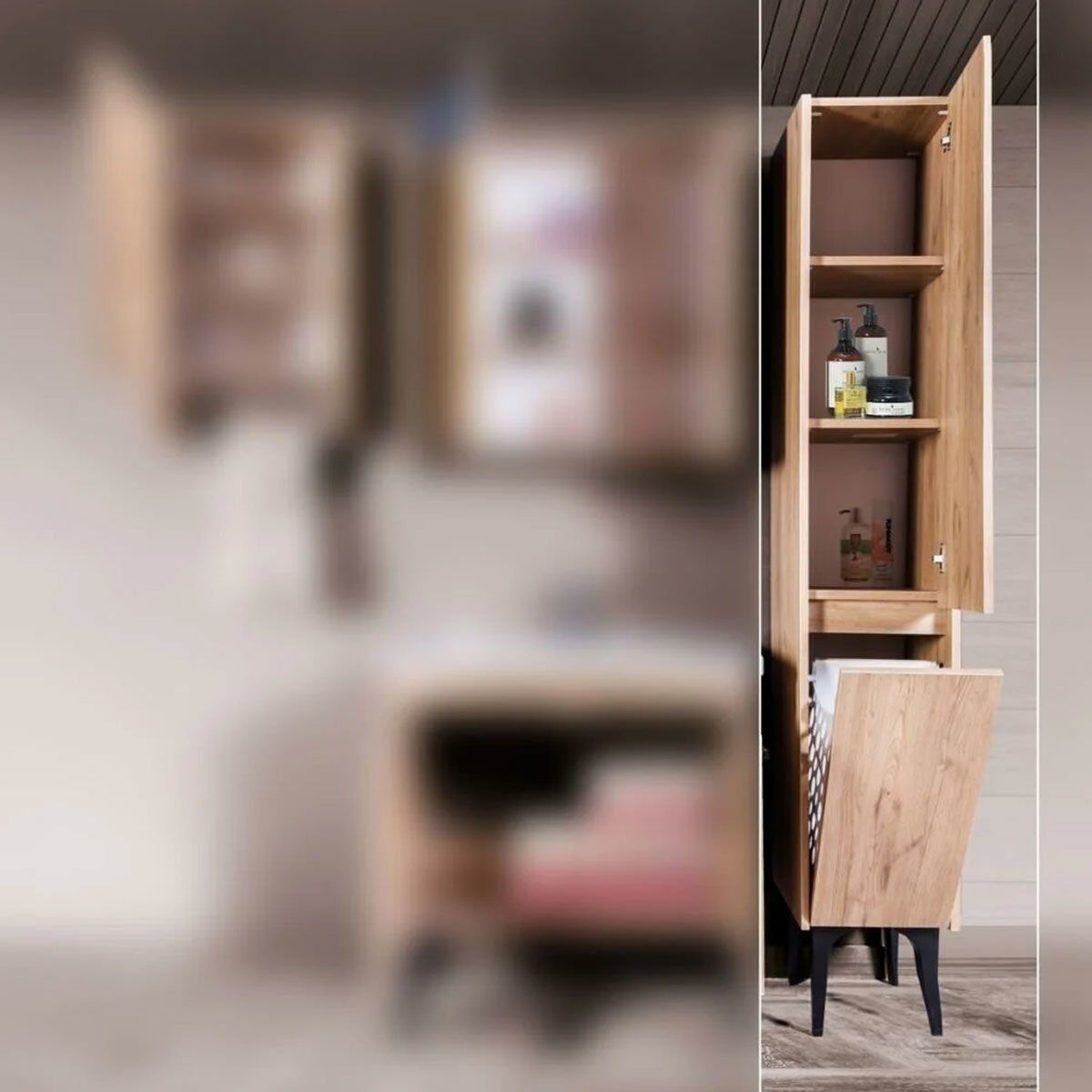 Ürünümüzde 2 raf ve 1 çamaşır sepetli bölme bulunmaktadır.